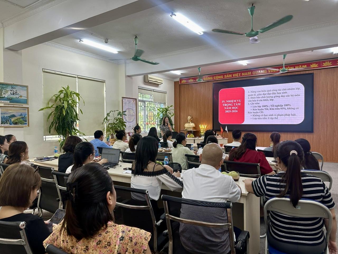 Tại buổi họp, cô Nguyễn Thị Hồng Vân – HT nhà trường đã triển khai nhiệm vụ trọng tâm của năm học mới, phổ biến kế hoạch khai giảng cũng như các hoạt động trải nghiệm dành cho học sinh.